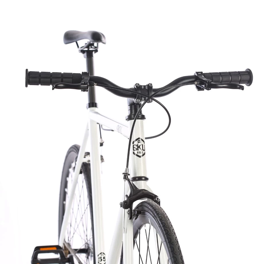 Das Evian 2 von 6KU ist ein auf jeder Ebene stimmiges Singlespeed/Fixed Komplettbike. Auffällig ist zuerst die weisse, extrem wertige Lackierung. In Verbindung mit den hauseigenen Hochflanschfelgen ist das schon mal die halbe Miete. Der Antrieb funktioniert klassisch über eine FlipFlop-Nabe, mit der du entweder Singlespeed oder fixed unterwegs sein kannst.